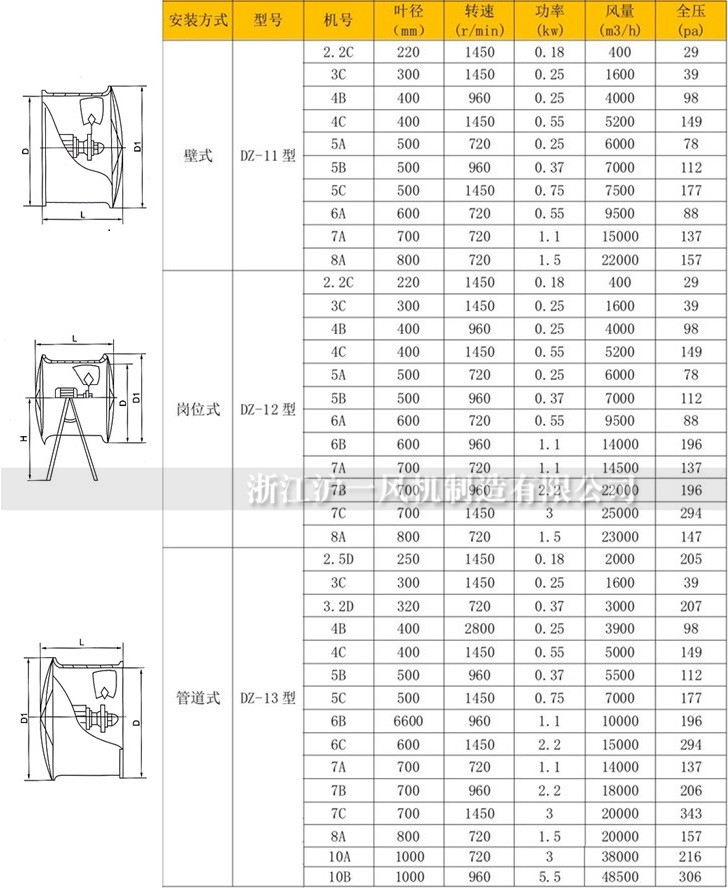 1.DZ系列低噪声轴流风机采用从声援入手、低转速、高压力系数的设计方法,研制成大弦长、空间扭曲、倾斜式宽叶片,使其在低转速驱动的前提下,达到所需风量、风压的目的,具有效率高、振动小、运转平稳等特点。