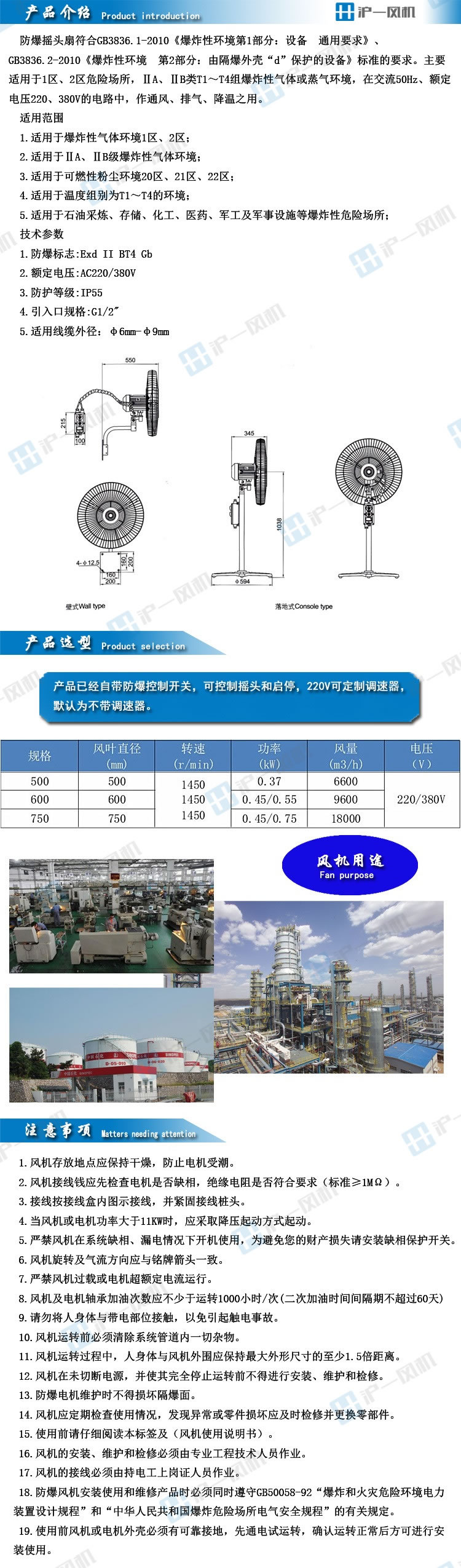 2、本产品具有防爆性能好、结构合理、运行平稳、使用方便、外形美观等优点。风叶采用高强度铝合金制成。适用于工厂内含有级别为ⅡA、ⅡB级,温度组另为T1-T4组的可燃性气体与空气形成的爆炸性气体混合物,划分区域为1去、2区的场所如:石油、、化工、机械、医药、冶金等行业的车间、仓库、办公室、加油站等处的防爆降温。
