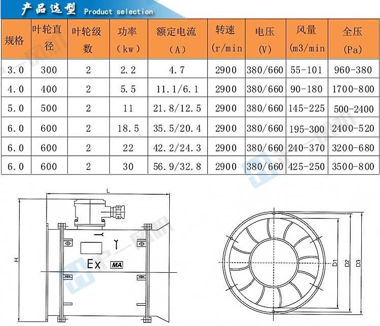 2、电动机为YB系列矿用隔爆型二极三相异步电动机,电压为380/660V,电动机的机座与机体焊成一体,电动机由叶轮输送的气流直接进行冷却。