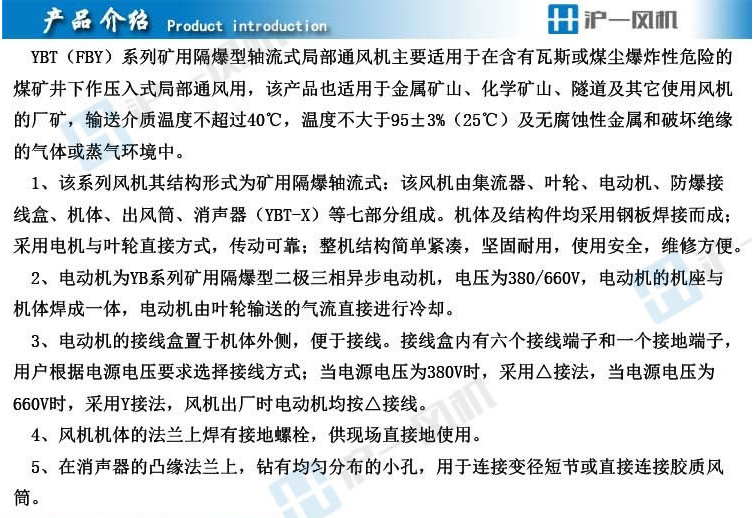 1、YBT11KW矿用防爆轴流风机该系列风机其结构形式为矿用隔爆轴流式:该风机由集流器、叶轮、电动机、防爆接线盒、机体、出风筒、消声器(YBT-X)等七部分组成。机体及结构件均采用钢板焊接而成;采用电机与叶轮直接方式,传动可靠;整机结构简单紧凑,坚固耐用,使用安全,维修方便。