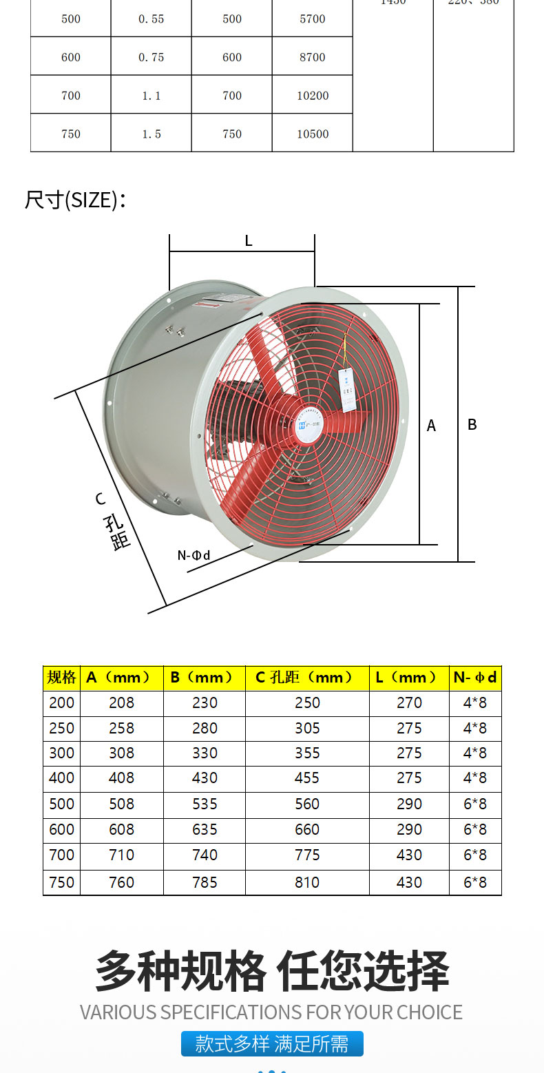 1.2.按直径分为250~1000mm共9种规格,每一规格风机叶片数都为4片,风量1000~48000m3/h,风压40~400Pa。